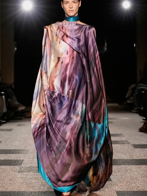 This collection leaned into a signature flair for drama, with striking silhouettes, sweeping gowns, and architectural draping that echo movement and fluidity. Bold colour-blocking and unexpected combinations including bright orange, royal blue, and even dip-dye effects (as seen in Look 12 - shown above) - inject vibrancy into the lineup, alongside clever contrasts between structured tailoring and softer, more romantic elements.