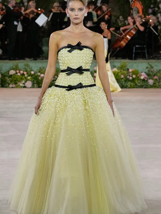 The silhouettes include dropped waists, capes, a- line, sweetheart, arched, square, collared, the list goes on and on. Each and every gown had so much individuality. With the collection telling a story throughout. First beginning with more simplistic silhouettes, added to with large white florals. Then moving on to a bow theme, which carried on throughout but started with the yellow embellished looks, moving swiftly onto green, then purple, then florals.