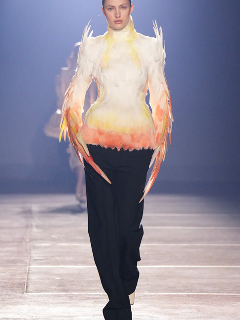 Animalistic references continued in Look 16 (above), where black tailored trousers were paired with a top covered in bird feathers that cascaded over the hands and neck, creating a striking avian effect. A similar feathered skirt appeared a few looks later, echoing the theme.