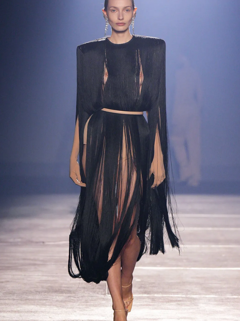Fringe, too, was of course present, but not in an overdone, been-there-done-that way. It was integrated into dresses, skirts, and tops, all worn nude underneath. As the models walked, the fringe swayed just enough to expose bare chests, leaning into the vulnerability Castro Freitas intended to explore.