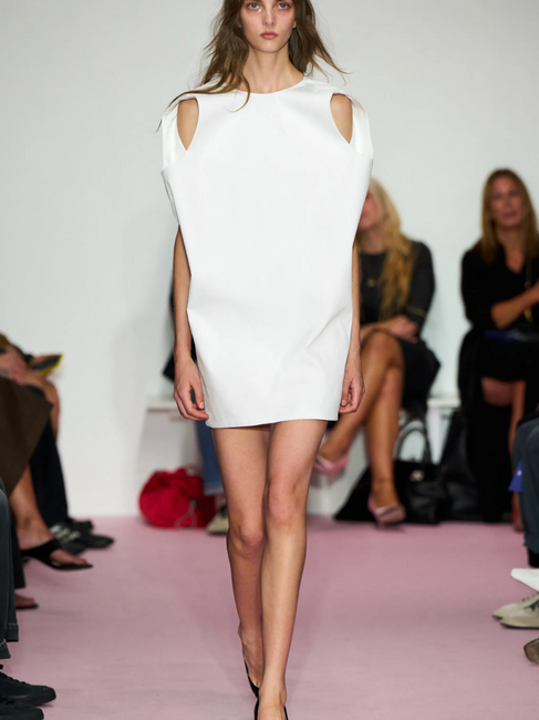 There’s a sense of maturity here too - Wu doesn’t surprise for shock’s sake. Instead, he lets the clothes take a natural lead. The palette shifts between stark contrast and soft harmony: chalky whites, muted neutrals, and occasional flashes of richer hues. The cuts are a mix between unwearable and wearable, due to the modern take on deconstructive design. Something that could definitely be worn at both a red‑carpet or a stylish night out.
