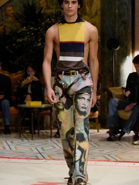 But things picked up quickly. Look 2 (above left) featured multicoloured jeans printed with about seven expressive faces in black lino print - a recurring motif throughout the collection. These artistic, face-covered pieces became signature moments, which I did love.
